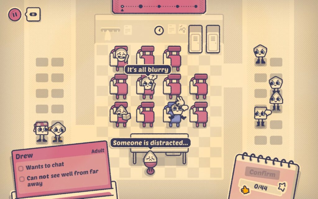 Is this seat taken? is not a bad game by any means. It is polished, well put together, but I just do not enjoy most of the levels, despite me liking the whole demo. After 2-3 cities with several levels, it gets old really quick. There are also some slight annoyances: I often believe clicking on the right spot, but for some reason, it’s the seat or character next to it, so I swap characters a lot of time without wanting to swap them. The one level where you need to fill the classrom but everyone has a crush on someone different was tedious, because there are no real means to follow the chain. You only see the crush of the character you’re hovering your cursor over. And since they all look pretty much the same, it’s very difficult to remember where you put Tom after having placed 6 other people and are now on Jon who as a crush on Tom, and you’re out of seats, except the one beside Tom. So yeah, I’m a bit sad I do not enjoy the whole game when I did the demo and I do not quit understand why.